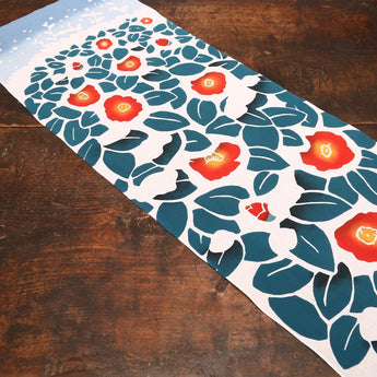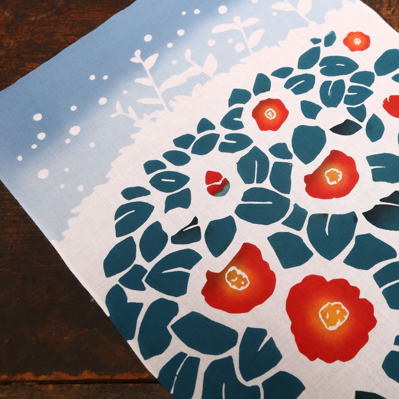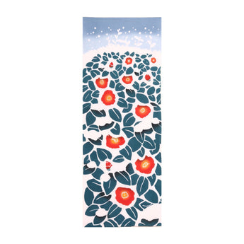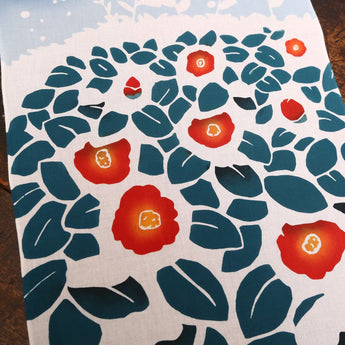 Un tenugui d'une beauté digne créée par le contraste de la neige et du camélia.