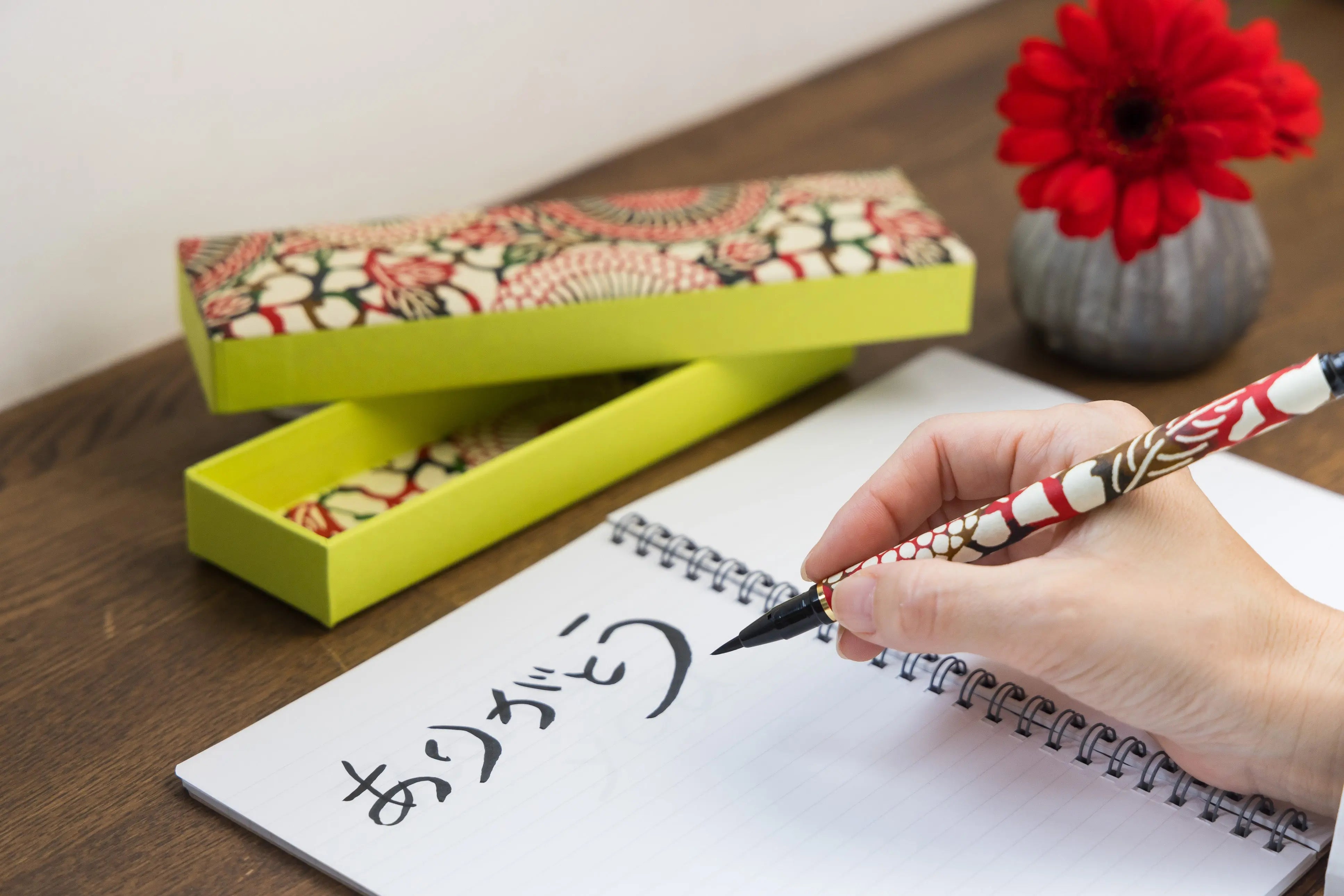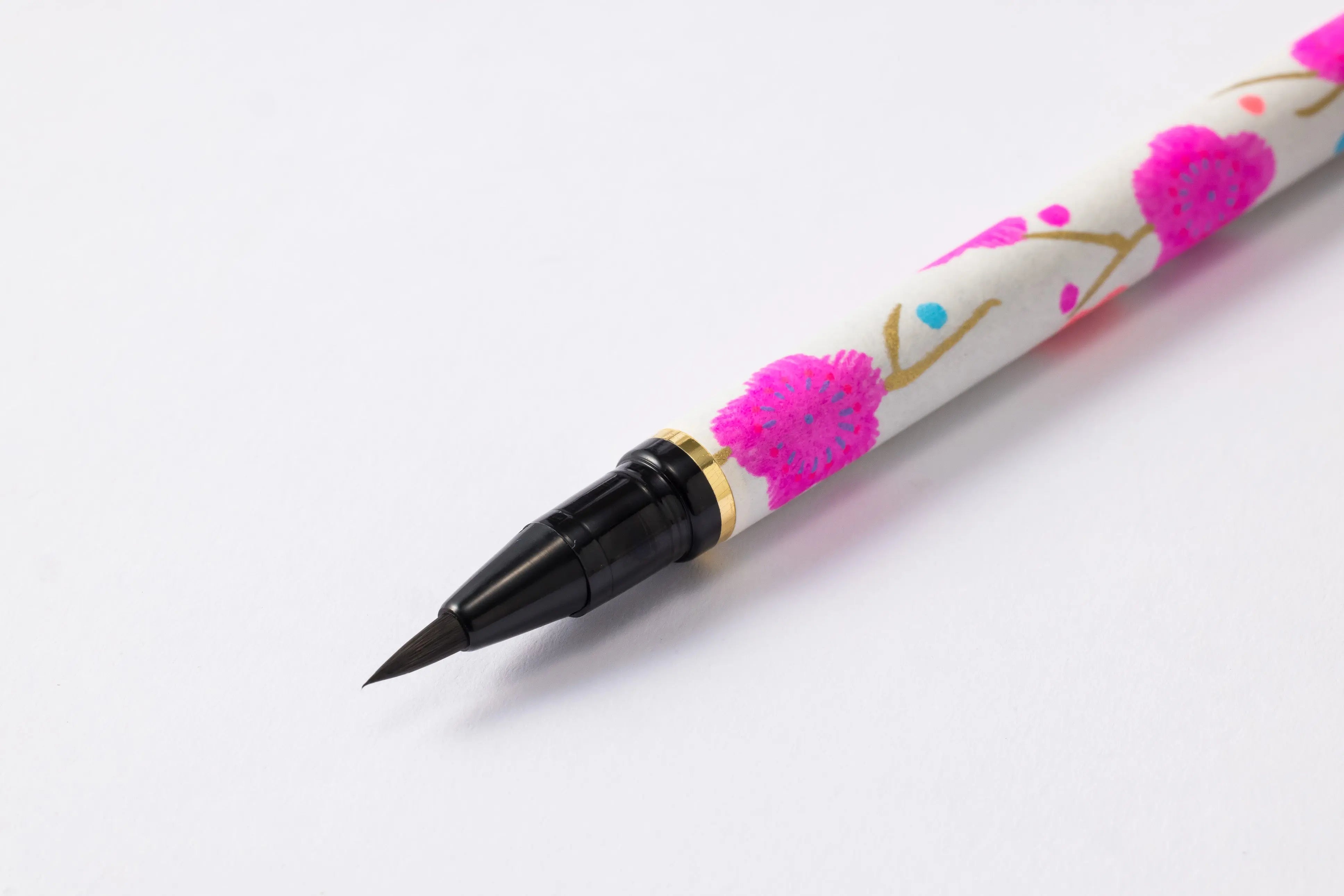 The pen is wrapped in Kyoyu shrine paper with a pen holder (shaft). Please enjoy the authentic writing feel of a brush pen and the gorgeous, pop pen.