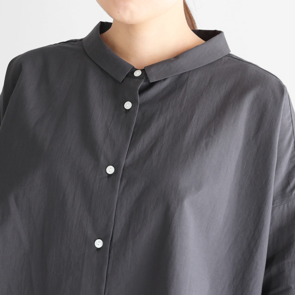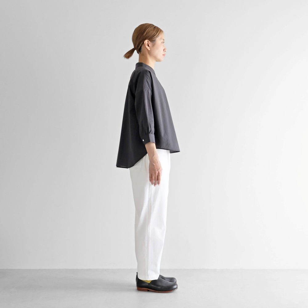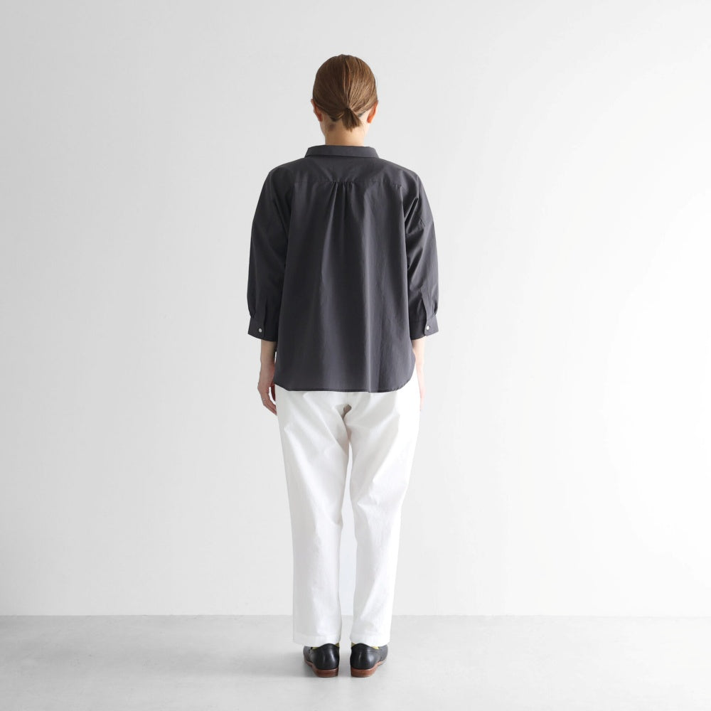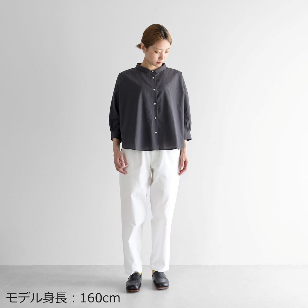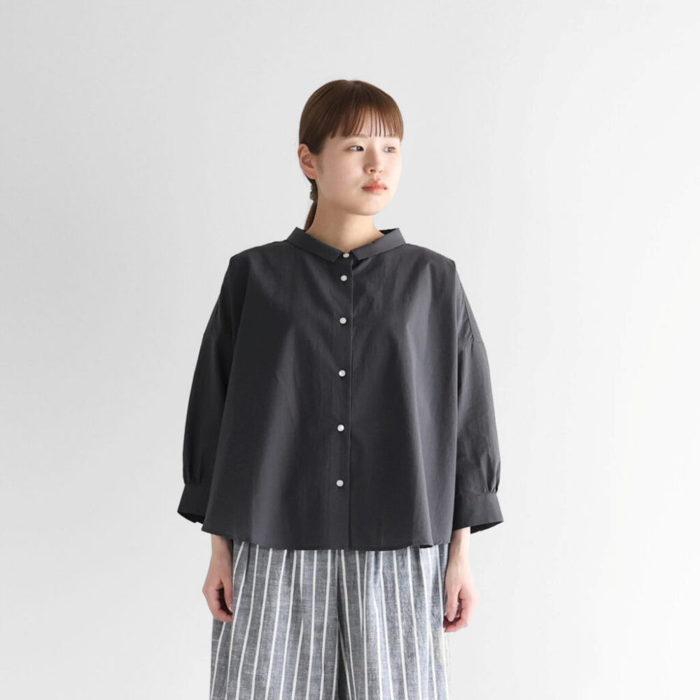 小さめの襟と首元のボタンがシンプルながらも上品なアクセントに。袖は8分丈に設計され、洗い物や家事仕事の際にも快適に動きやすい仕様です。